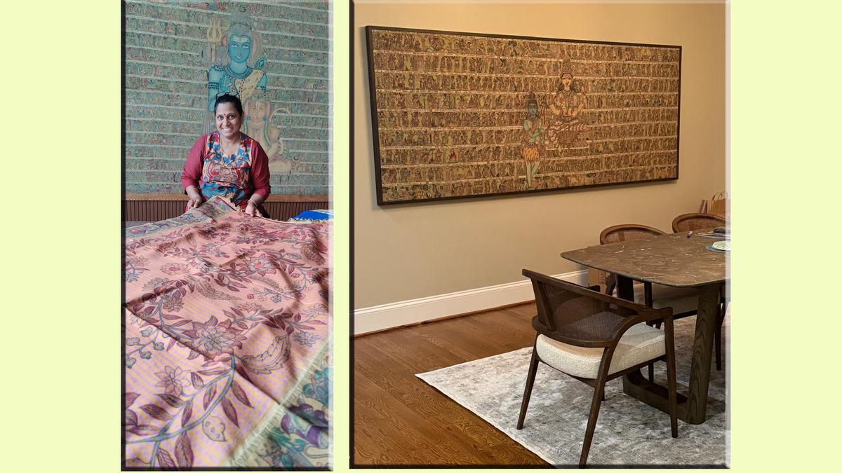 A nine-foot tall, 15-foot wide hand-drawn kalamkari wall panel, dyed in natural colours, dresses up Mamata Reddy’s workspace in Hyderabad. The wall panel features a rare combination of Shiva and Hanuman. Large images of the two deities are flanked by 16 four-inch horizontal panels bearing smaller pictorial narration of stories of Shiva and Hanuman, interspersed with text. Mamata, founder of the three-decade old Kalam Creations that supports 45 artisan families in Tirupati, reveals that the wall panel is a labour of love of 14 months.